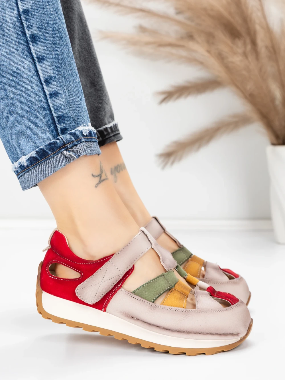 Pantofi Sport Dama din piele naturala 2576 Crem-Rosu | Advancer