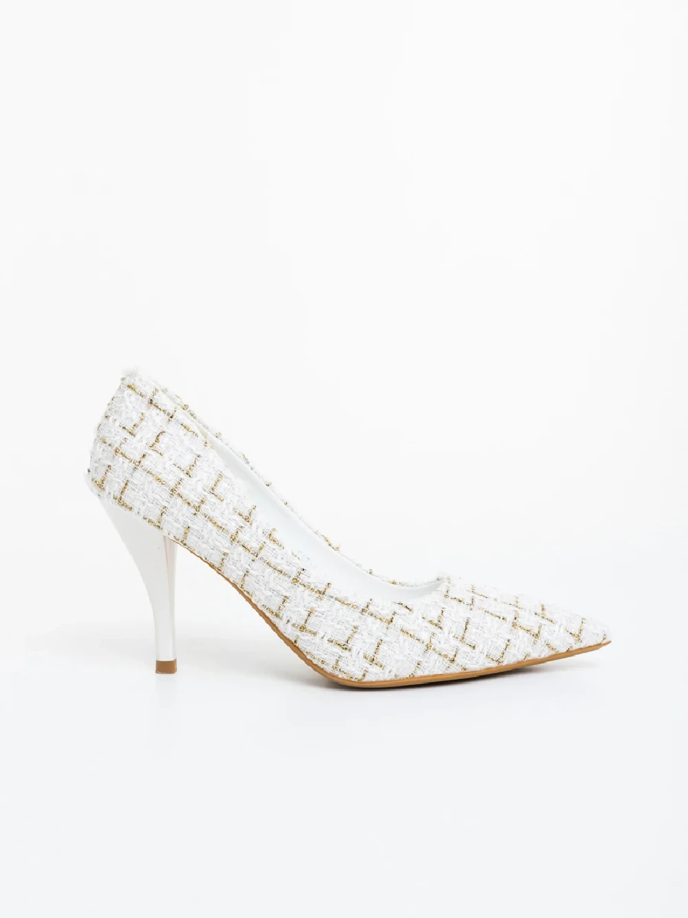 Pantofi dama cu toc albi din material textil Vicara Detalii produs